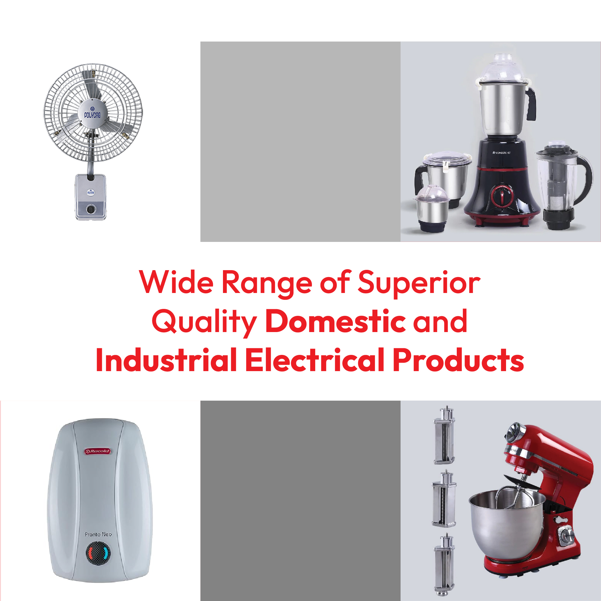 We are distributor of Water Heaters, Home & Kitchen Appliances, Ceiling Remote Fans, Tower Fans and dealers for a wide ranging product line includes Industrial heaters & Thermostats, Oil Machines, Industrial & Domestic Irons etc. The products comes from reputed and standard manufactures like Racold, Wonderchef, Aco, Polycab, Time, Girish-Heat, Shreeja, Ketco.